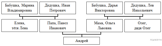 Меня зовут Андрей. Мой папа работает токарем на заводе, его зовут Павел Иванович. У него есть сестра Лена, она учится в Москве на юриста. Их родители, мои бабушка и дедушка, живут в соседнем городе Березники Пермского края. Бабушка Марина Владимировна работает в школе, а дедушка Иван Петрович охранником. На праздники мы ездим к ним в гости.