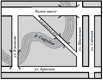 Наш дом стоит на улице, которая называется Ближняя. Из своей комнаты я вижу не только речку Струйку, но ещё Сосновый переулок. Он пересекает наш квартал наискосок, соединяя Школьную улицу и Лесное шоссе. Шоссе проходит через весь наш город насквозь. Наша улица Ближняя тоже выходит на Лесное шоссе, а с другой стороны упирается в Красную улицу. Я не знаю, почему улица называется Красной. Может быть, потому что дома на ней построены из красного кирпича? Моя школа тоже из красного кирпича. Она находится на Красной улице между улицами Школьная и Садовая.