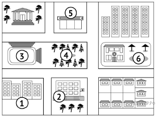 Рассмотри план города. Пользуясь описанием, которое дала Таня, отметь на плане цифрами шесть объектов.