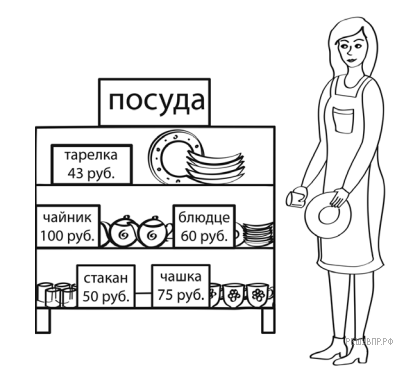 Рассмотри рисунок и ответь на вопрос: сколько рублей сдачи получит покупатель, расплатившийся за одно блюдце и один стакан купюрой в 500 руб.?